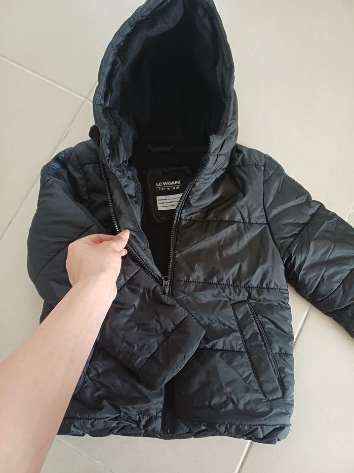 Siyah, kapüşonlu, fermuarlı, yumuşak ve sıcak kumaştan yapılmış erkek çocuk montu. Düz ve sade tasarıma sahip, rahat kalıplı.