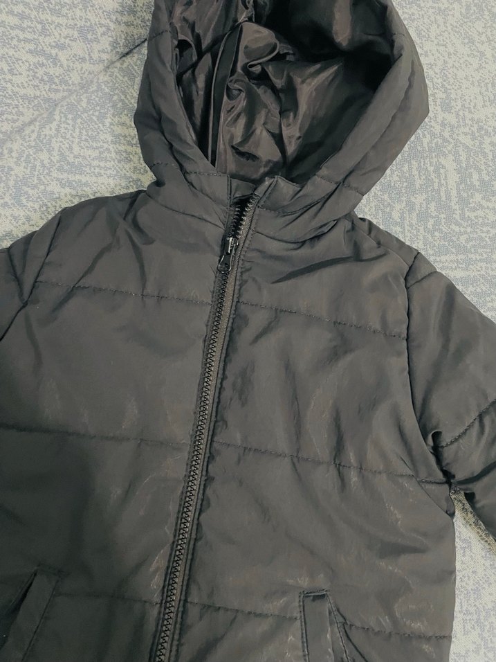 Fermuarlı ve yüksek yakalı, yumuşak kumaştan yapılmış gri renkli erkek çocuk montu. Sokak stiline uygun sade tasarım. Çok az kullanıldı sorunsuz