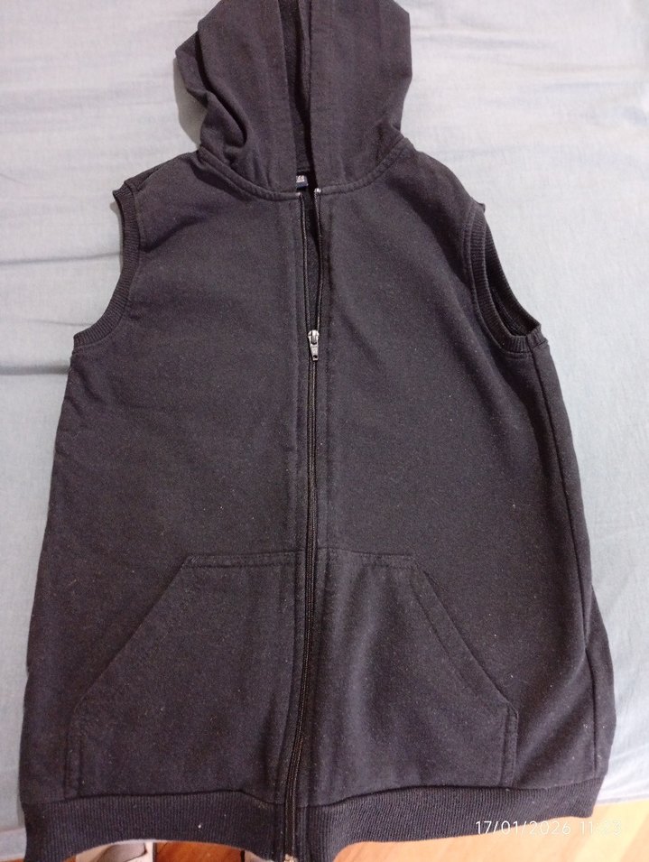 Yumuşak ve sıcak kumaştan, fermuarlı ve kapüşonlu siyah erkek çocuk yeleği. Kolsuz, yüksek yakalı ve dar kesimdir, sokak tarzına uygundur.