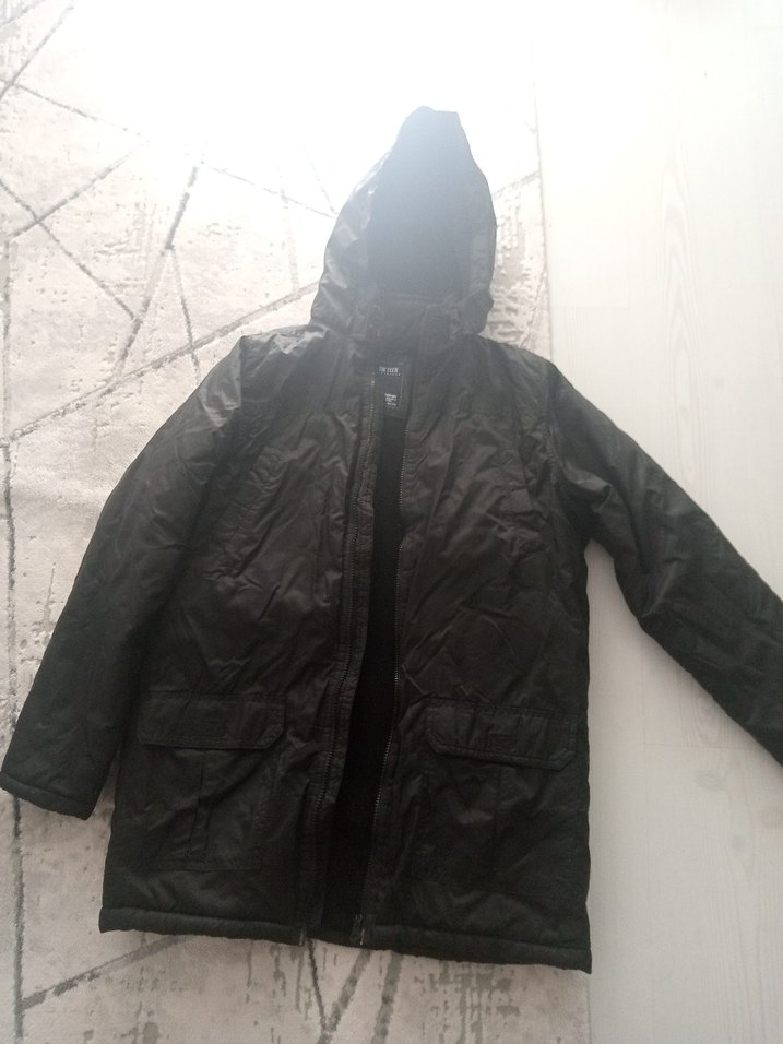 Erkek çocuklar için kapüşonlu, kürk detaylı, siyah ve dar kesim kaban. Notch yaka ve sade desensiz, sokak stiline uygun.