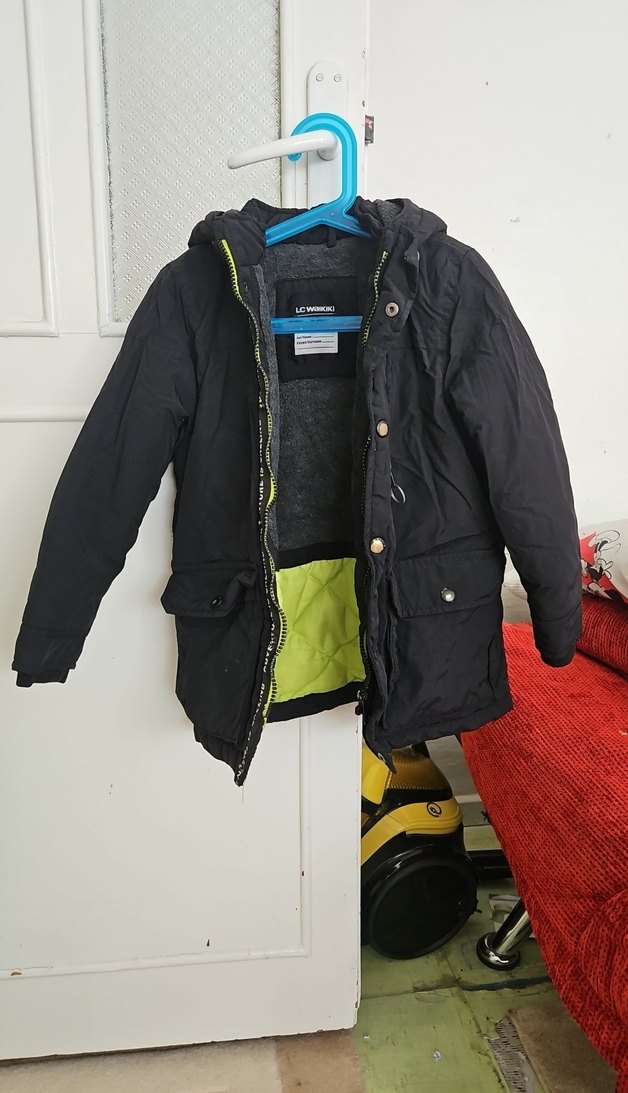 Siyah, kapüşonlu ve fitted kesim erkek çocuk montu, sıcak tutan fleece astara sahiptir. Fermuarlı ve çıtçıtlı.Siyah renklidir.
