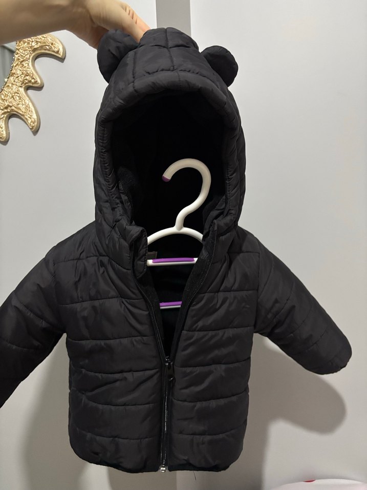 Siyah renkli, kapüşonunda ayı kulakları bulunan, kürklü ve yumuşak dokulu erkek çocuk montu. Notch yaka ve dar kesimle sokak tarzına uygun.