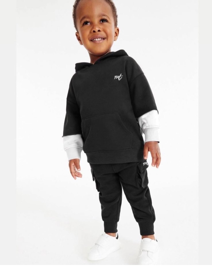 Erkek çocuk için siyah kapüşonlu, oversize kesim ve kabartmalı detaylara sahip, yumuşak ve sıcak kumaştan eşofman takımı.