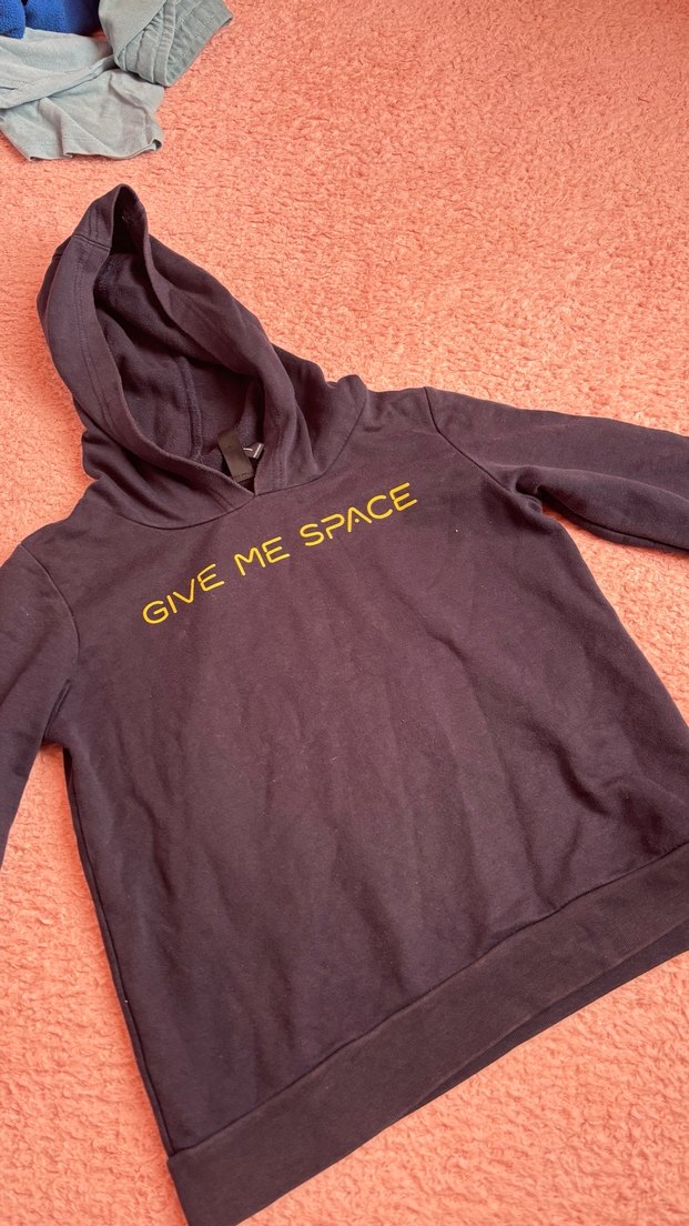 erkek çocuk siyah kapüşonlu, uzun kollu sweatshirt. üzerinde 'GIVE ME SPACE' baskısı ve cırt cırtlı detay bulunur. Günlük rahat kullanım için uygundur.