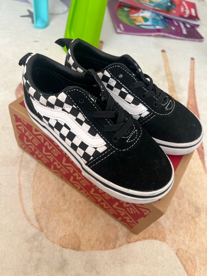 Siyah kareli desenli Vans çocuk spor ayakkabısı. Kauçuk tabanlı, cırt cırtlı ve sokak tarzına uygun. Trendy günlük kombinlere uygun