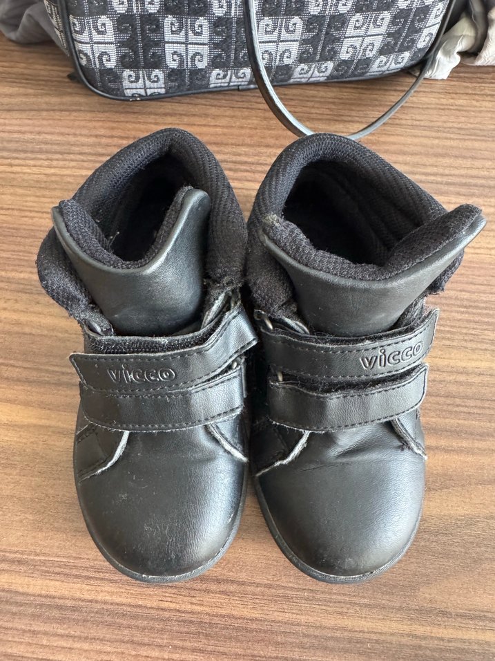 Kauçuk malzemeden yapılmış, velcro bantlı siyah erkek çocuk botları. Düz, normcore tarzda ve koyu renkte.
