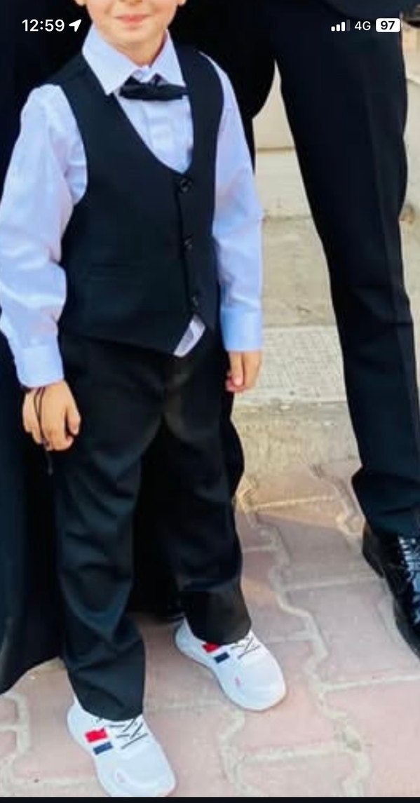 Erkek çocuklar için siyah renkli, kemerli yelek ve klasik kesim pantolondan oluşan takım. Sokak tarzı için uygun şık ve sade tasarım. Gömleğin arka kısımda ip çekmiş foto da mevcut 2 defa giyildi