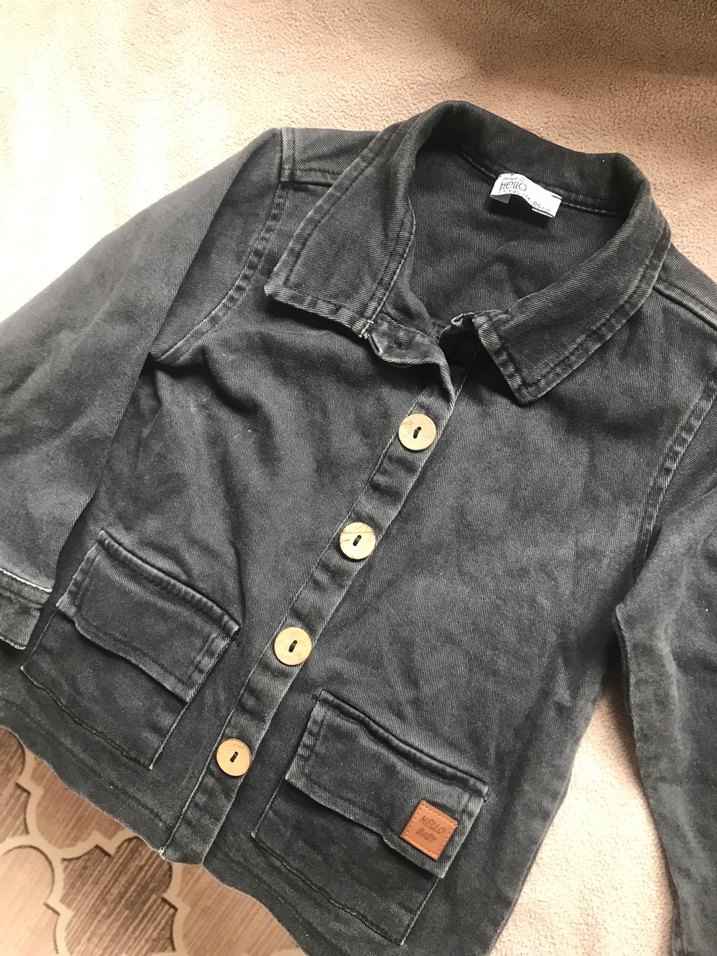 Erkek çocuk siyah kot ceket, düğmeli ve notalı yaka detayına sahip. Uzun kollu, bol kesim ve cep detaylarıyla günlük kullanıma uygundur.