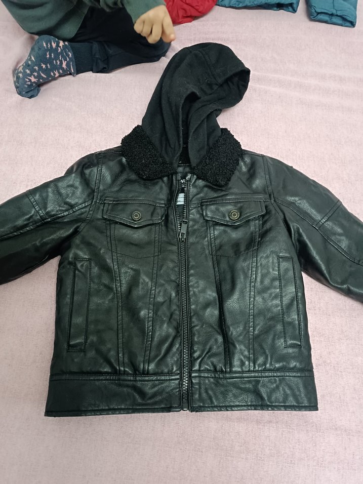 Erkek çocuklar için siyah, kürklü yakalı, deri biker tarzı, fitted kesim ceket. Kapüşonlu ve ön fermuarlı, şık bir tasarıma sahiptir aldık hiç giydirmedim yeni.