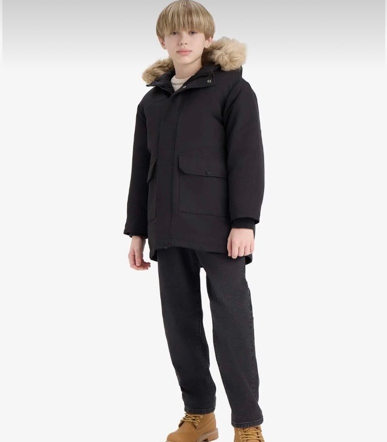 Erkek çocuklar için siyah, regular fit, kürklü kapüşon ve yumuşak fleece kumaştan yapılmış mont. Trendy ve rahat sokak stili için uygundur.