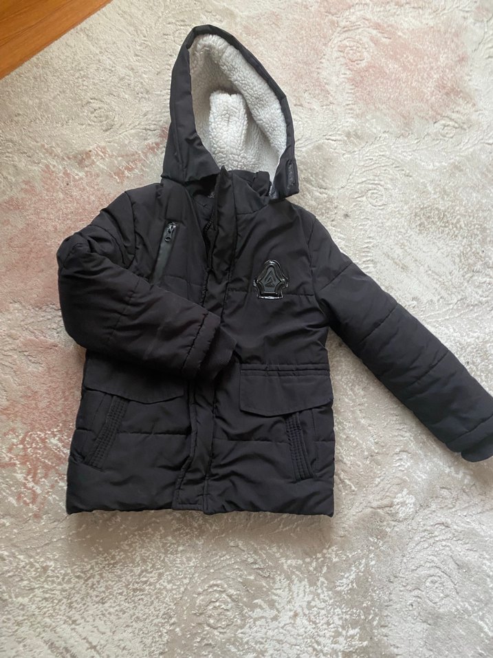 Erkek çocuklar için siyah, kürklü kapüşonlu ve kesimli bir mont. Sokak stili ve çoklu ceplere sahip, yumuşak ve sıcak astarlı.