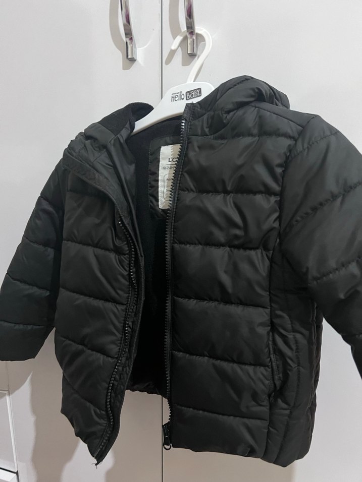 Erkek çocuk için siyah, kürklü detaylı, yumuşak ve sıcak kumaştan yapılmış, notalı yakalı, dar kesim mont.