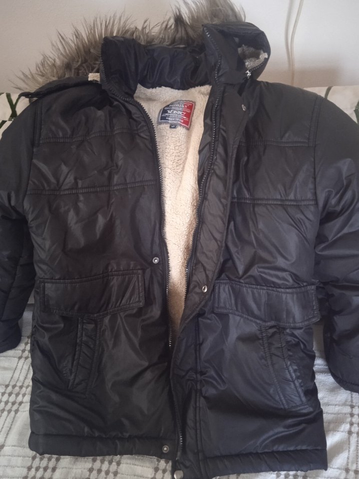 Erkek çocuk için kısa kesim, kürklü kapüşonlu, sıcak iç astarlı siyah kaban. sıfırdır