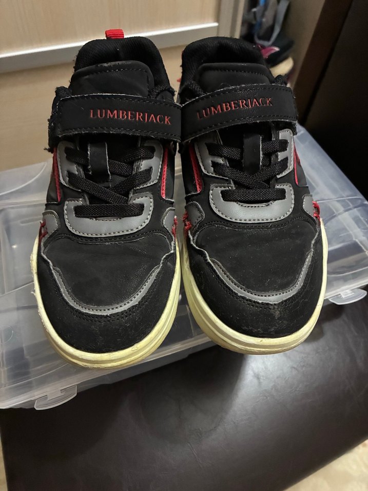 Erkek çocukları için siyah Lumberjack marka, kayışlı ve kauçuk tabanlı spor ayakkabı. Rock punk tarzını yansıtan sokak giyimi stilinde, desensiz ve dayanıklı. 32 numara topuk daki kurdele dışında bir problemi yok