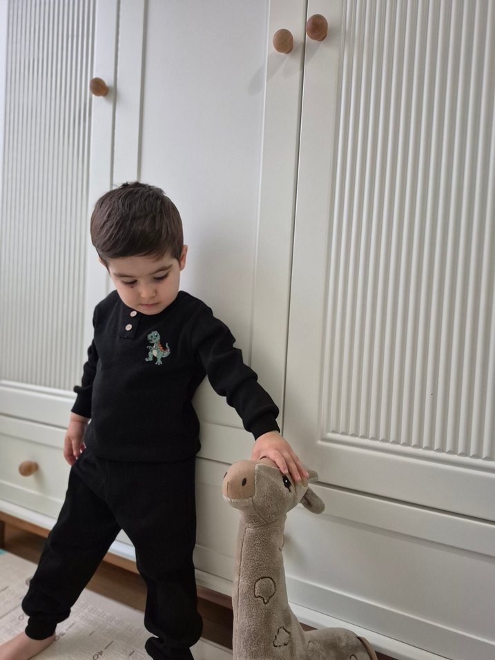 Siyah, nakışlı ve düğmeli boğazlı sweatshirt ile rahat kesim eşofman takım. Trendy ve rahat kullanım için uygundur. 2 yaştan 5 yaşa kadar stok