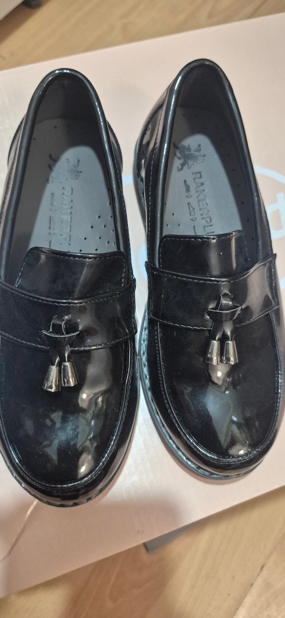Siyah parlak erkek çocuk özel gün ayakkabısı, lastik malzemeden ve tokalı detaylı. Klasik goth tarzında püsküllü tasarım içerir.