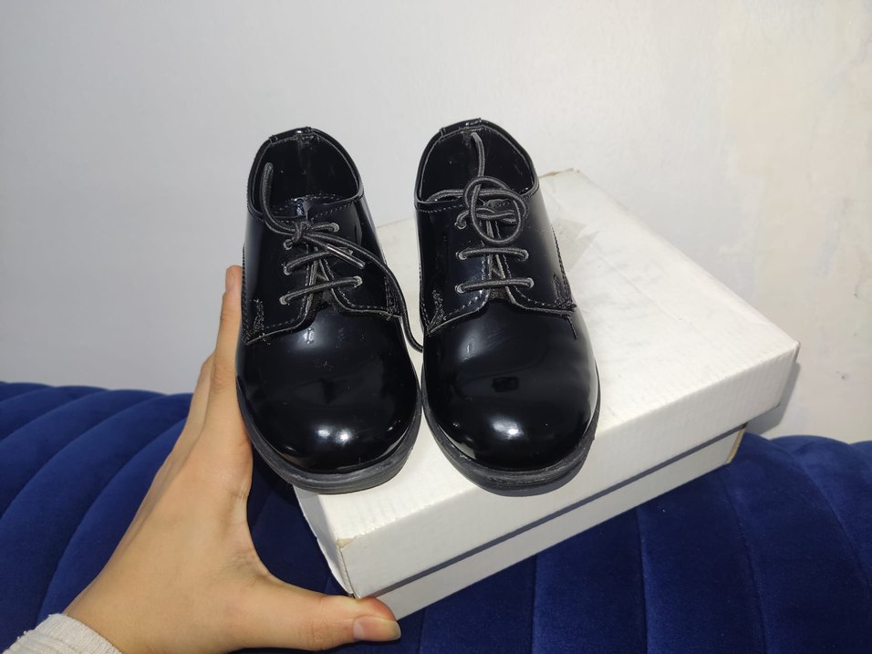 Parlak siyah rugan görünümlü, tokalı ve bağcıklı, dayanıklı kauçuk malzemeden yapılmış erkek çocuk özel ayakkabı.