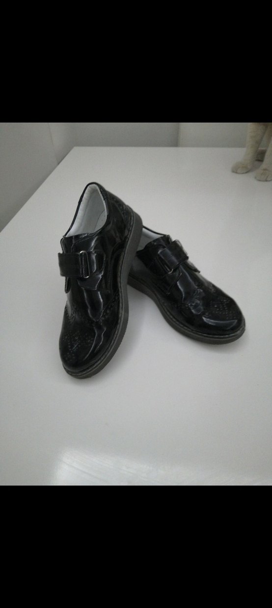 Erkek çocuklar için siyah rugan tokalı, kauçuk tabanlı, goth tarzında özel gün ayakkabısı. Desensiz ve koyu renkte.