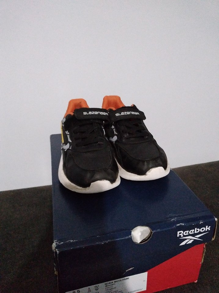 Siyah renkli, baskılı desenli erkek çocuk spor ayakkabısı, ayakkabının burun kısmı fotoğraftaki gibi aşınmıştır onun dışında bır kusuru yoktur