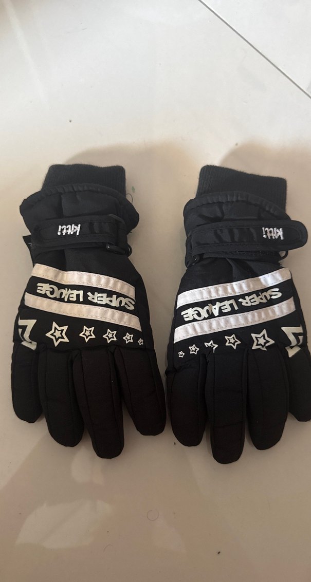 Yumuşak ve sıcak kumaştan, baskılı yıldız desenli, cırt cırtlı siyah erkek çocuk streetwear eldivenleri.