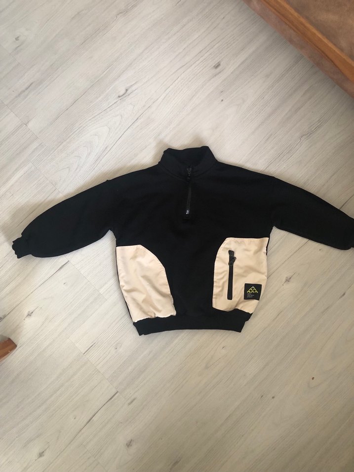 Erkek çocuklar için siyah, uzun kollu, bol kesim sweatshirt. Önünde fermuar ve bej renkli fermuarlı cepler bulunur. Sokak stili için uygundur. Bedeni tam 3-4 yaştır. 3 yaşına da 4 yaşına da gayet güzel oluyor yırtık sökük defolu hiçbir yeri yok.