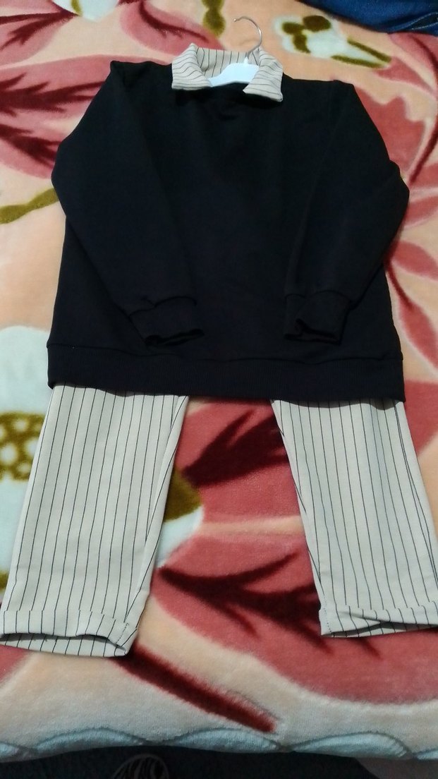 erkek çocuklar için siyah uzun kollu, yuvarlak yakalı sweatshirt ve gri çizgili, pileli pantolonlardan oluşan rahat kesim takım..7.8.9