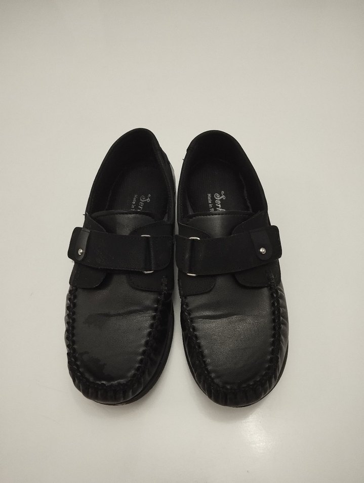 Siyah tokalı, lastik malzemeden yapılmış erkek çocuk loafer ayakkabılar. Düz ve goth tarzında, desensiz tasarıma sahiptir. 1 saat giyilmistir