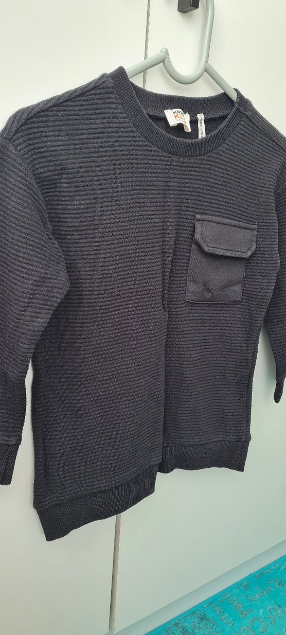 Siyah renkli, triko örme, yuvarlak yaka ve uzun kollu erkek çocuk sweatshirtü. Rahat kesimli, sentetik kumaştan, küçük cep detaylıdır. Rengi tam siyah degildir kendinden oyleydi belirteyim, asla solma yok Koton marka..