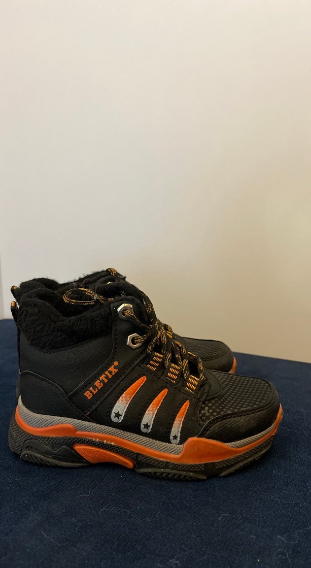 Siyah ve turuncu renkli, Velcro ve bağcıklı, baskılı detaylara sahip, rahat ve sıcak iç yapılı erkek çocuk botu. Sokak stiline uygun.