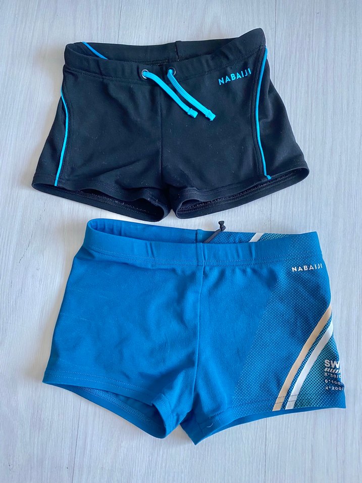 Erkek çocuk için siyah ve mavi renkte, kısa paçalı ve sade tasarımlı mayo şortları. Üzerlerinde Nabaiji marka yazısı bulunur.