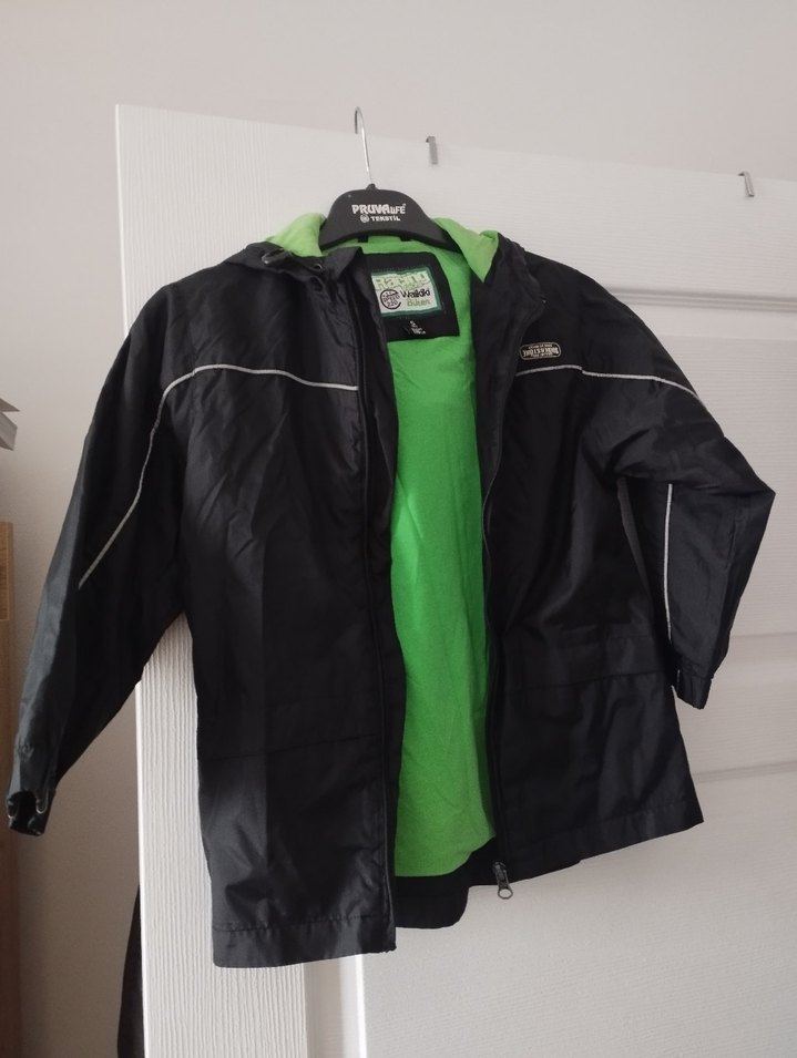 Erkek çocuk için yüksek yakalı, fermuarlı ve bol kesim siyah yağmurluk. İç kısmı koyu yeşil yumuşak kumaş ile kaplıdır. Desensiz, modern sokak stili için uygundur. ️