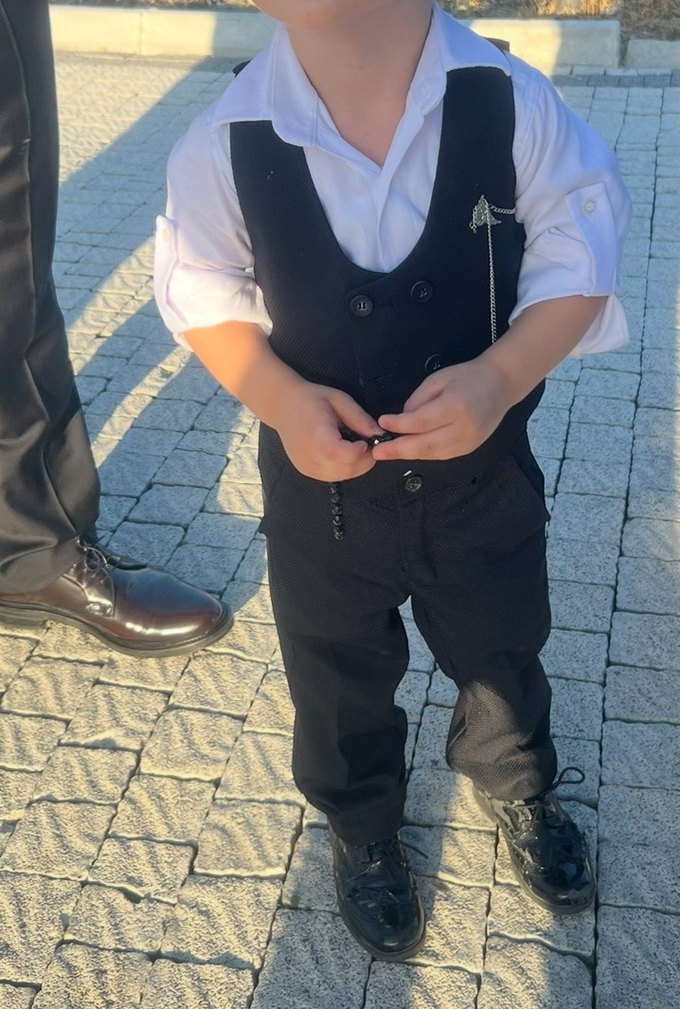 Düğmeli siyah yelek ve beyaz uzun kollu gömlekten oluşan, kesimli yakalı, trend sokak stili erkek çocuk takımı.1 kere giyildi. Etiket yaşı 3