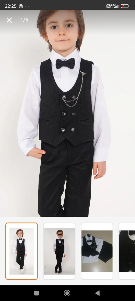 Düğmeli ve zincir aksesuar detaylı kolsuz siyah yelek, beyaz uzun kollu gömlek ve siyah pantolonla kombinlenmiştir. Notlu yaka ve papyon ile trend bir görünüm sunar. 2 yaşındaki oğluma sadece düğünde giydirdim 2 saat birkez giyildi