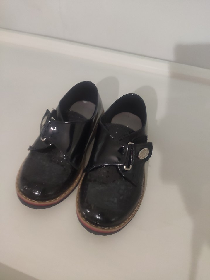 Erkek çocuklar için siyah yılan desenli, tokalı, kauçuk malzemeden yapılmış özel gün ayakkabısı.