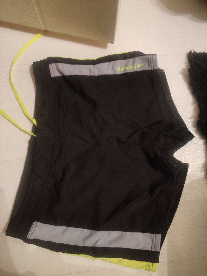 Gri yan şeritler ve sarı bağcık detaylı siyah erkek çocuk yüzme şortu, decathlon marka 8-10 yaş icin uygun