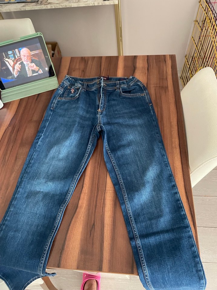 1 kez giyildi kusuru yok beli ayarlanabilir lastikli Erkek çocuklar için slim fit mavi denim pantolon, klasik tasarım ve tokalı detaylara sahip. Sokak stiline uygun.