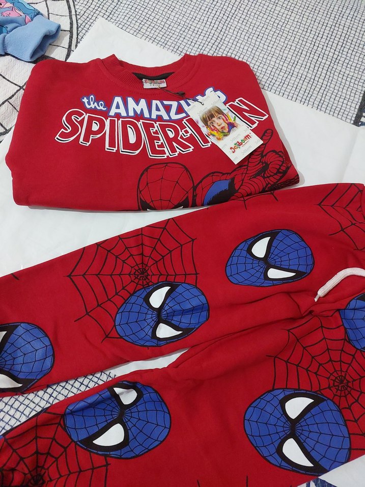Erkek çocuklar için kırmızı, uzun kollu, bisiklet yaka, fermuarlı ve Spiderman baskılı renkli pijama seti. ️2 iplik pamuklu urundur..etiketleri uzerinde ihrac fazlasi urunlerdir.. gri olan 6 7 yasa uygundur..