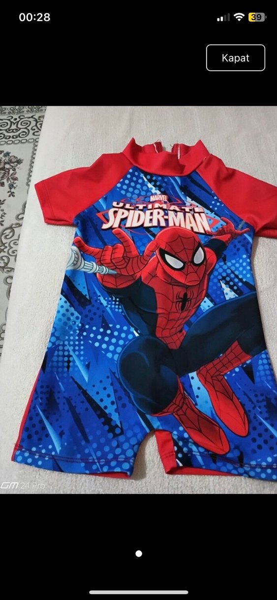 Kırmızı ve mavi zemin üzerinde canlı Spiderman baskılı, kısa kollu renkli erkek çocuk maye. Ön kısmında hareketli Spiderman figürü yer alır. ️