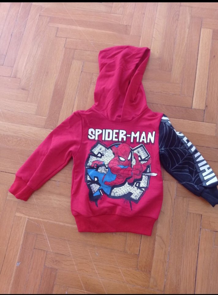Kırmızı kapüşonlu, fermuarlı ve uzun kollu, Spiderman baskılı, bir kolu örümcek ağı desenli, dar kesim sweatshirt. ️