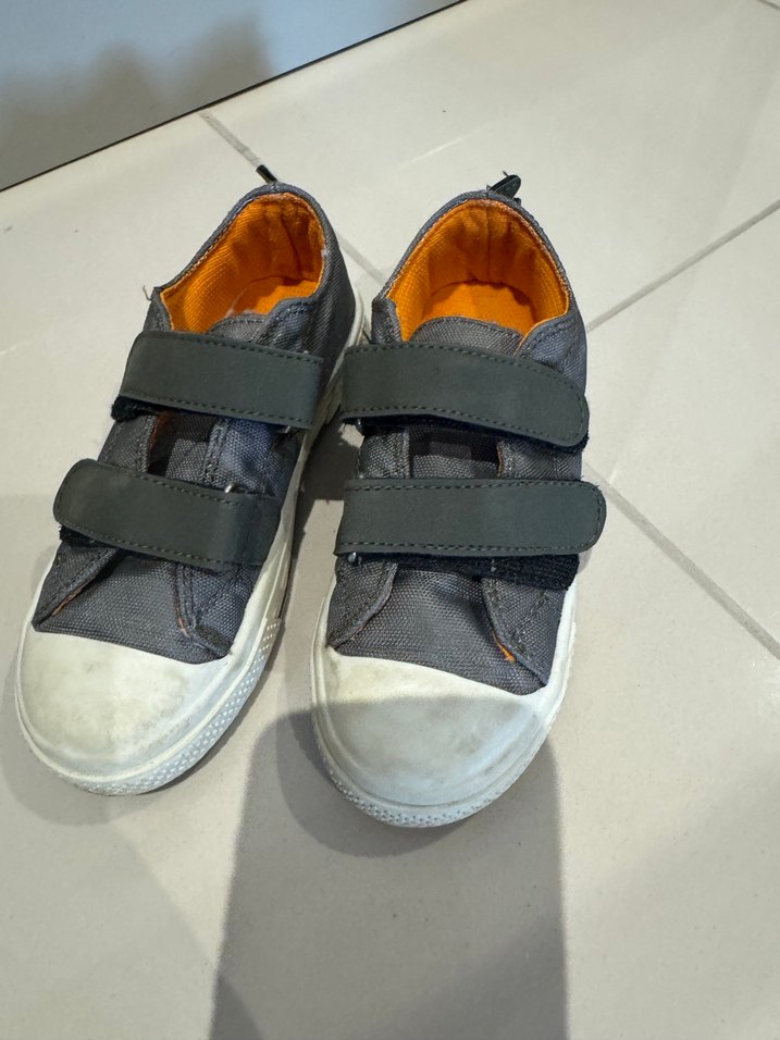 Haki renkli, bağcıksız cırt cırtlı erkek çocuk spor ayakkabısı. Lastik tabanlı, turuncu iç astarlı ve tie-dye desenli sokak stili ayakkabı.