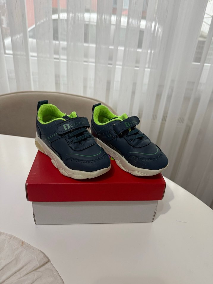 renkli, baskılı desenli erkek çocuk spor ayakkabısı. Kauçuk tabanlı ve Velcro bantlıdır. İç kısmı parlak yeşildir.