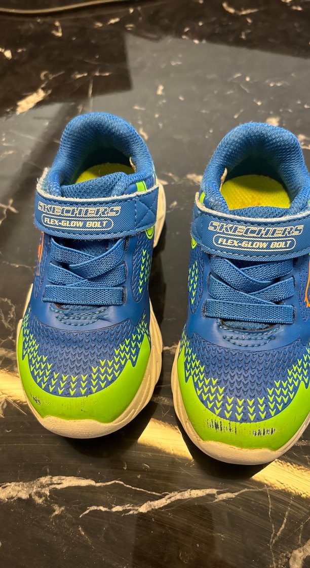 Renkli mavi tasarıma sahip, kolay kapanan skechers bantlı erkek çocuk spor ayakkabısı. Düz model, sokak stili için uygun. "FLEX-GLOW BOLT" yazılıdır. Işıkları yanmaktadır. Hiç bir sorunu yok az kullanıldı.