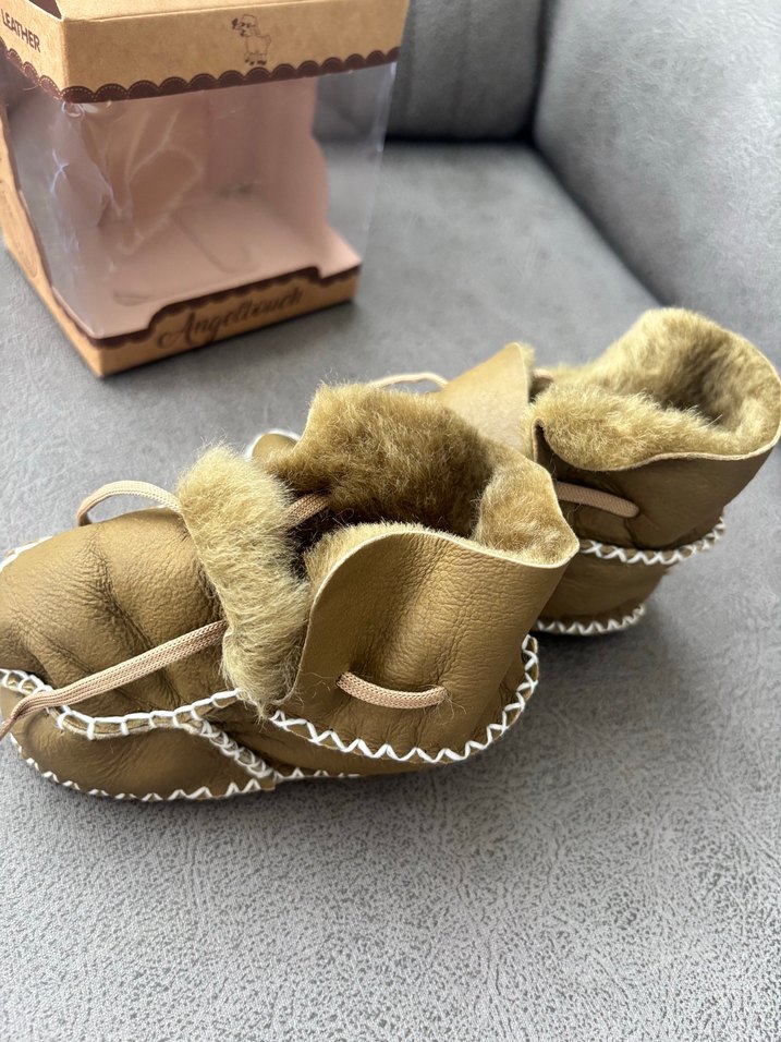 Erkek çocukları için haki renkte süet bot, yumuşak kürk detayları ve işlemeli kenarlarıyla bohem tarzında. Rahat ve sıcak tutar.