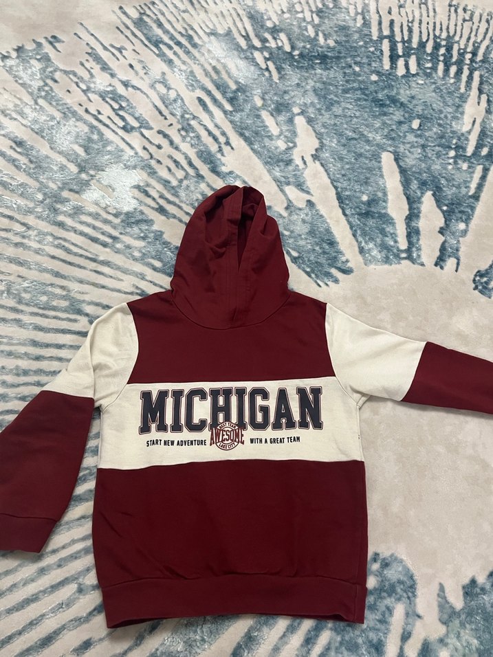 Bordo renkli, kapüşonlu ve uzun kollu bu sweatshirt, beyaz panelli Michigan baskısına sahiptir. Yumuşak, örgü görünümlü kumaştan günlük rahatlık ve sokak stili sunar.4/5 yaştır.