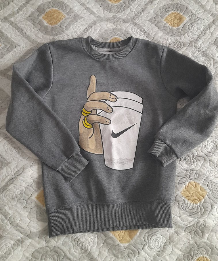 Gri, yuvarlak yaka ve uzun kollu, baskılı tasarımlı sweatshirt. Yumuşak kumaştan, içi polardir kalın sıcacık tutar. az kullanılmış iyi durumda