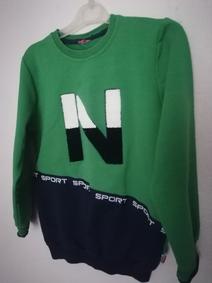 Koyu canli yeşil rengiyle erkek çocuk sweatshirtü. Uzun kollu, bisiklet yaka, bol kesim ve 'N' ile 'SPORT' yazılı baskısiyla harika spor bir ürün. Bir kez giydirildi sadece. Dolapta giyilmeyi beklerken. giymeden küçülen ürünümüz. Sifir ayarindadir. 7. 8 yaşa uygundur.