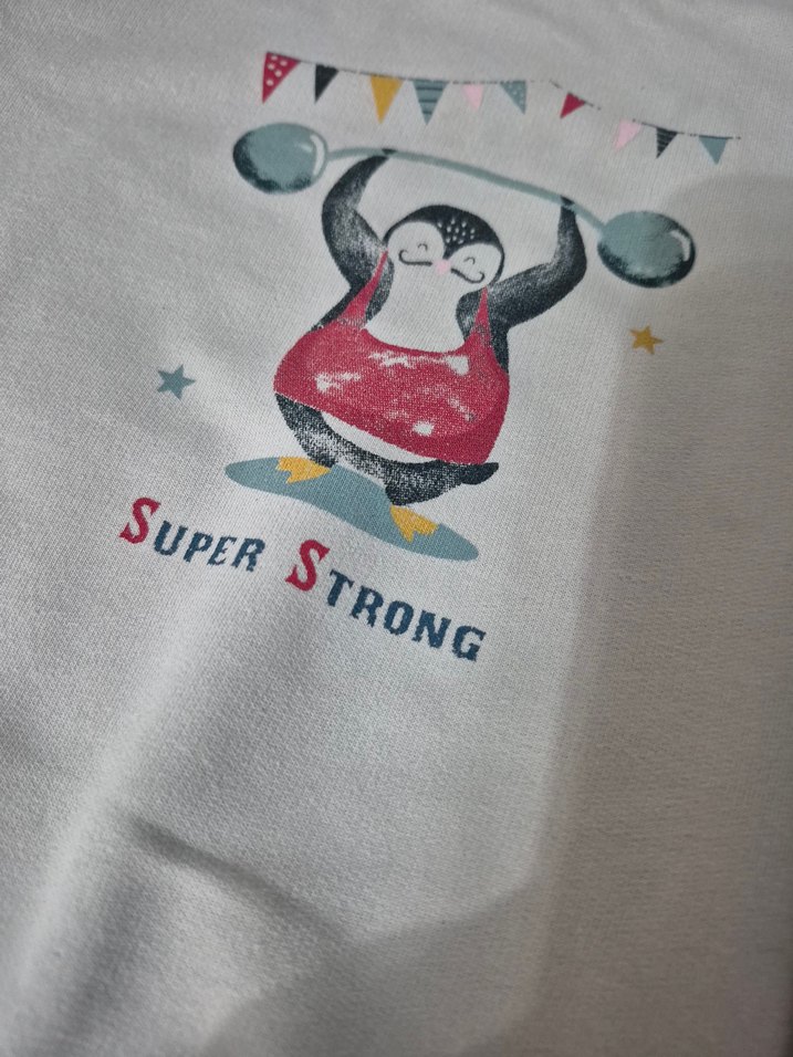 bej renkte, penguen baskılı ve "SUPER STRONG" yazılı renkli desenli bebek sweet