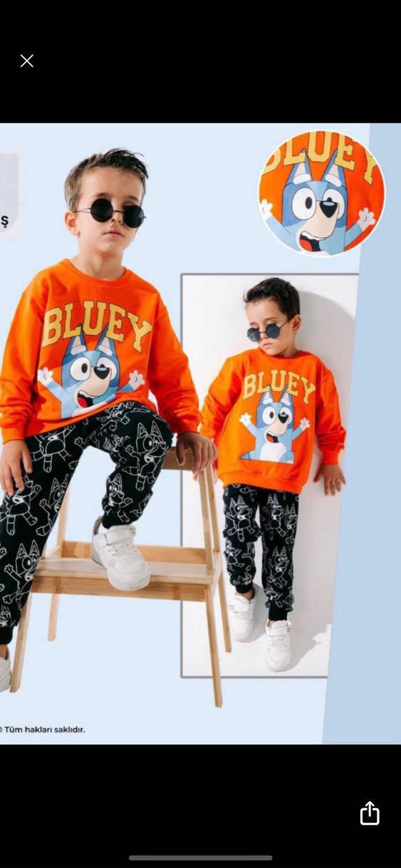 Rahat kesim, yumuşak kumaşlı, renkli baskılı erkek çocuk eşofman takımı. Parlak detaylı, 'BLUEY' yazılı mavi sweatshirt ve desenli siyah pantolon.