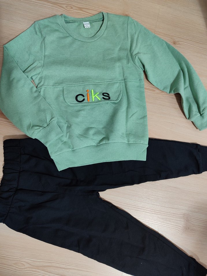yeşil,sweatshirt, yumuşak ve sıcak kumaştan üretilmiştir. Önde renkli 'ciks' baskılı, örme detaylı l bulunur. Siyah eşofman altıyla kombinlenmiştir. en 35 boy 48 kol boyu 40 cm alt pantolon bel 23 boy 60 cm 5 yaş etiketli ölçülere bakarak aliniz