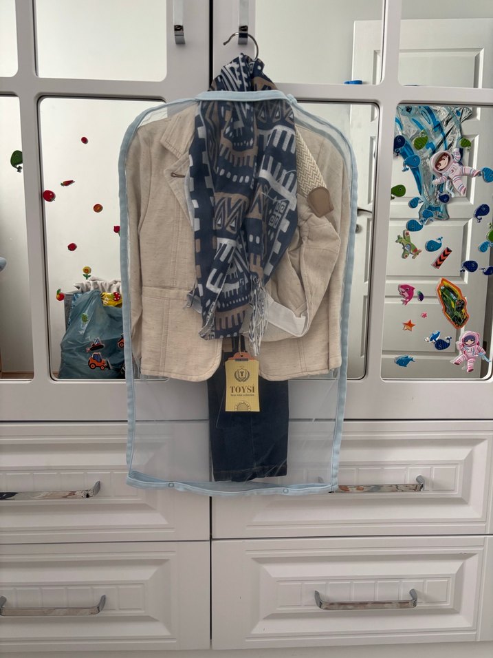 Ürün etiketli sıfır. Pantolon, ceket, gömlek, şapka, kemer ve fular şeklinde takımdır.